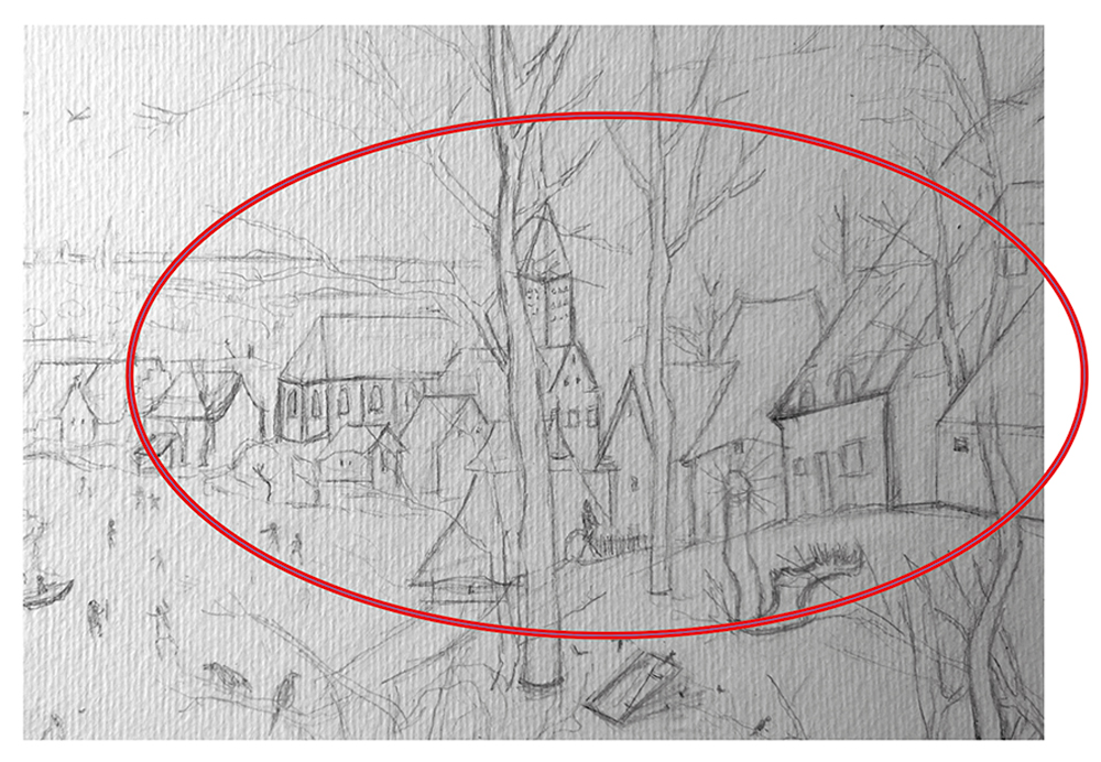 notre étude de la perspective. l’ellipse rouge sert à indiquer l’endroit qui va être analyser et développer