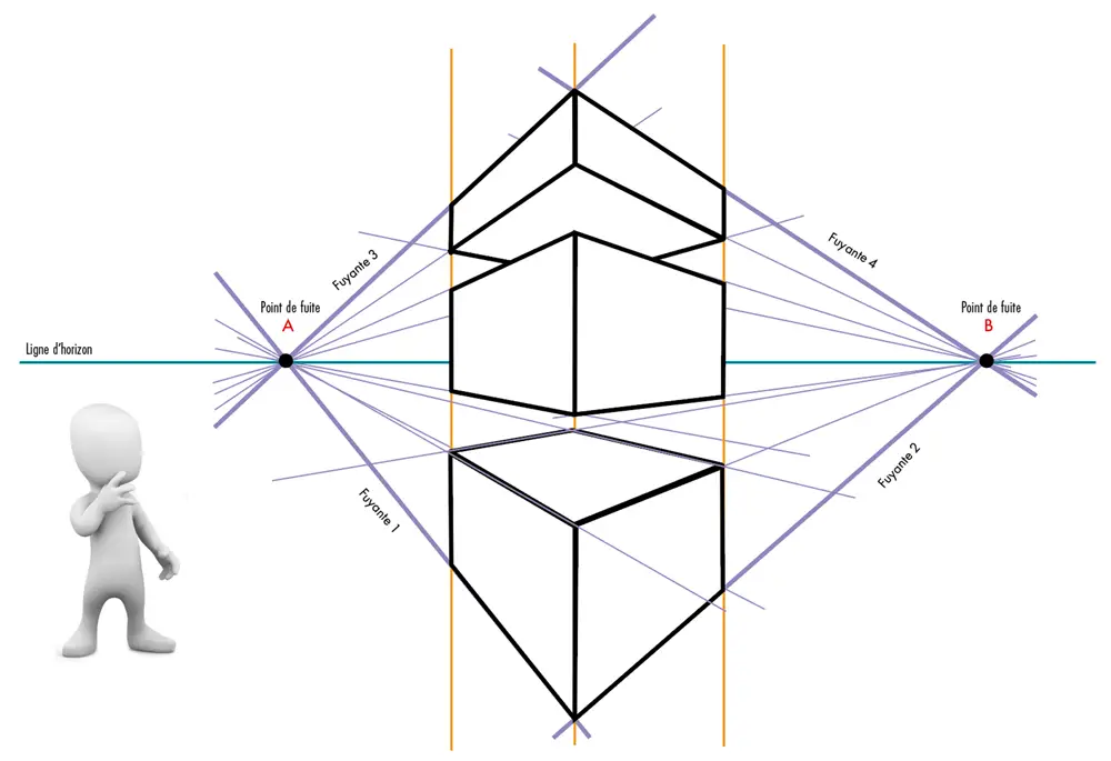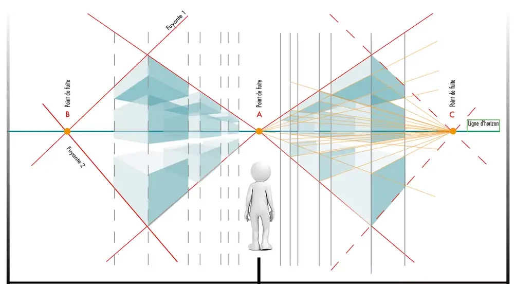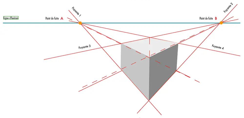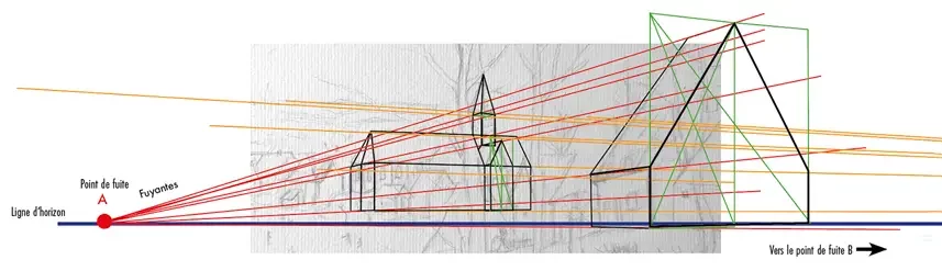 Dans cette construction, le point de fuite A est proche de la composition alors que le point de fuite B est éloigné et n’est par conséquent pas visible dans cette composition.